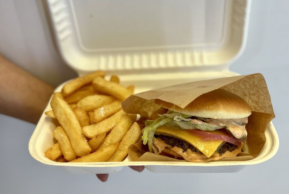 Briochebolli, 175 gr. hakkibúffur, cheddarostur, súltaður reyðleykur, agurksalat, salat, heimagjørdur dressingur